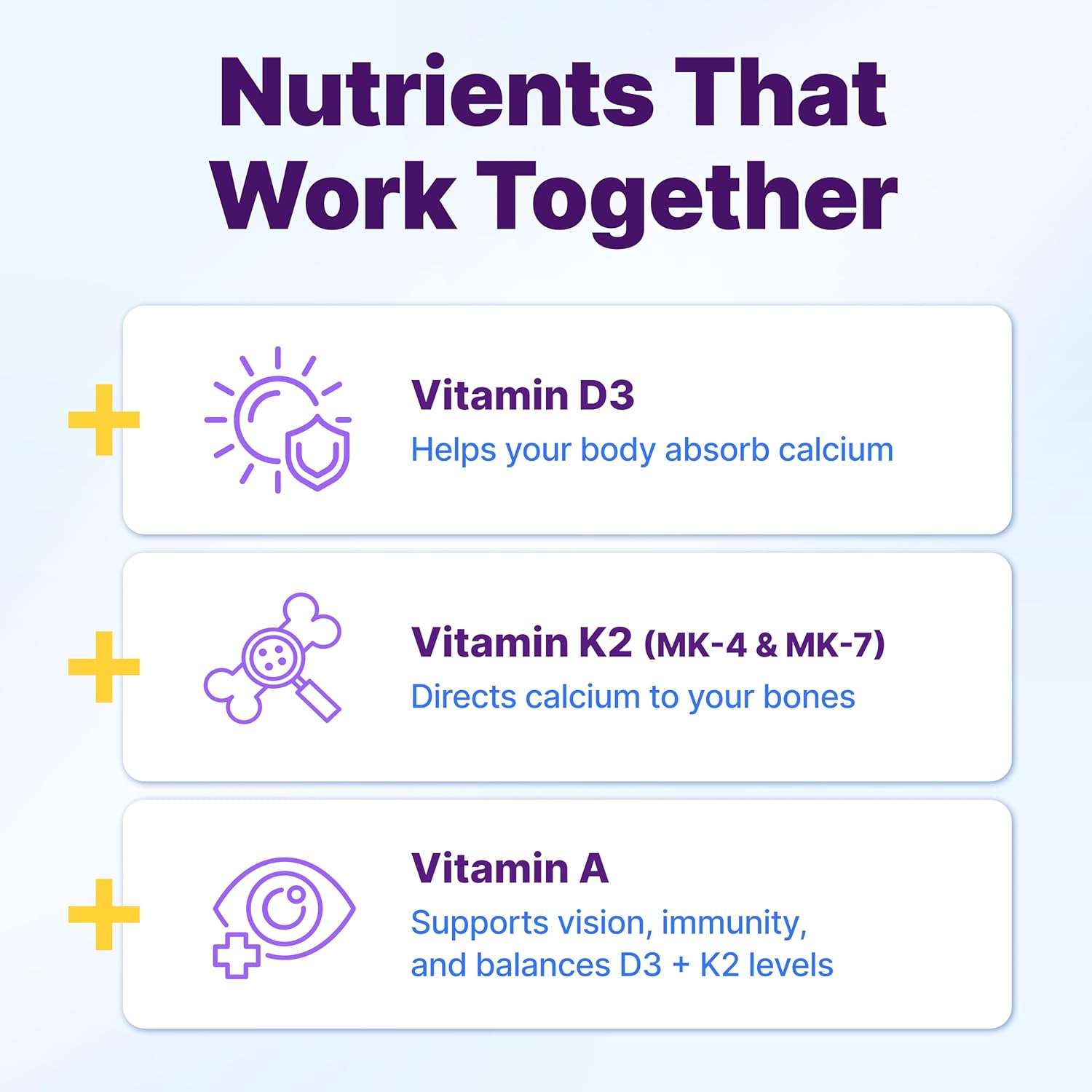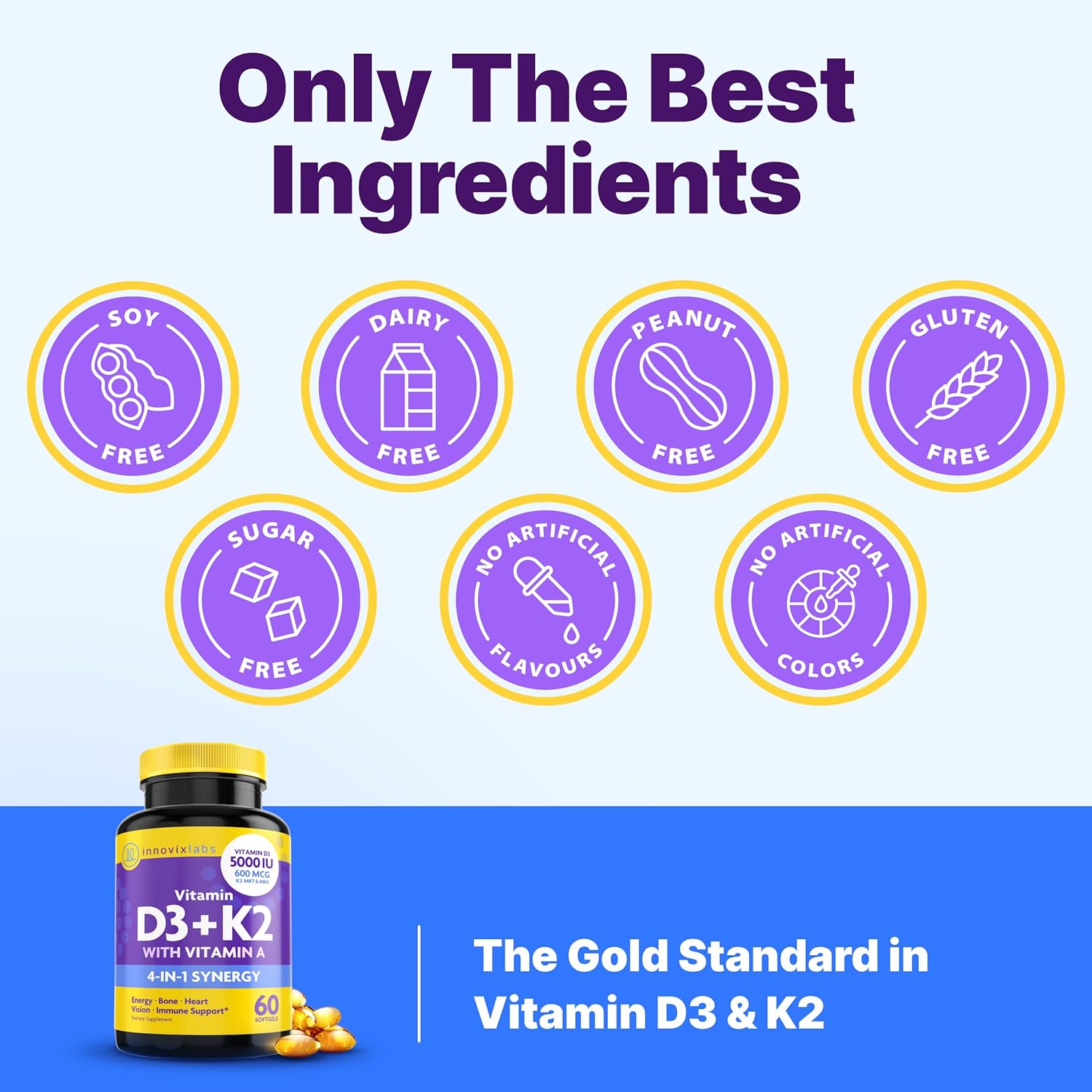 - 5000 IU D3, MK4 and MK-7 forms of K2, Plus Vitamin A